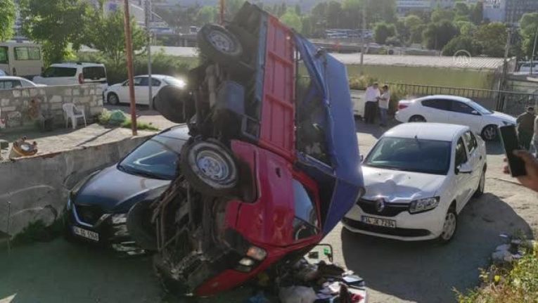Sürücüsünün araçtan inmesinin ardından bir anda freni boşalan kamyonet, önündeki boşluktan düşerek, ön tarafta bulunan park halindeki 2 otomobilin üstüne devrildi.
