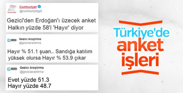 Daha önce yayınladığı iki anket sonucunda "hayır" oylarını yüzde 50'nin üzerinde oranla önde olduğunu, bundan bir önceki ankette ise "evet"in öne geçtiğini söyleyen Gezici Araştırma, bugün yayınladığı ankette ise "evet" oylarının yüzde 51.3, "hayır" oylarının ise yüzde 48.7'de kaldığını ifade etti.