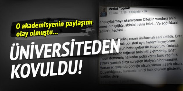 "Barış İçin Akademisyenler İnisiyatifi" bildirisinde de imzası bulunan Vedat Toprak, sosyal medya hesabından yaptığı bir paylaşımda polisler için kan donduran ifadeler kullanmıştı. Toprak, olayın açığa çıkması üzerine görev yaptığı üniversiteden atıldı.