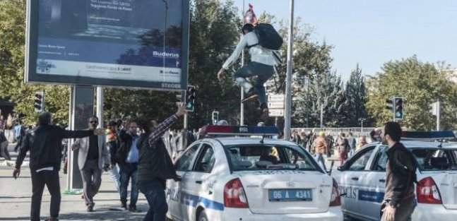 Ankara Sıhhıye meydanında yapılacak 'Emek, barış, demokrasi' mitinginin toplanma yeri olan Ankara Tren Garı önünde gerçekleşen canlı bombalı saldırısonrası alanda bulunan eylemciler polise ve polis araçlarına saldırdı.