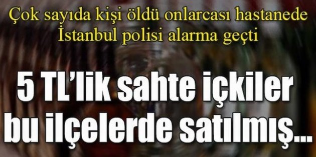Fatih'te son 3 gün içinde çok sayıda kişinin baygınlık, şiddetli karın ağrısı, kusma ve görme kaybı gibi belirtilerle hastanelere kaldırılması üzerine polis alarma geçti. Alkol zehirlenmesi nedeniyle Samatya Eğitim ve Araştırma Hastanesi'nde tedavi altına 7 kişiden alınan Ercan Tümey hayatını kaybetti. Asayiş Şube Müdürlüğü Cinayet Büro Amirliği ekiplerinin söz konusu ölüm üzerine, Adli Tıp Kurumu ile irtibata geçti ve son 3 günde, Tümey'in dışında 8 şüpheli ölümün daha metil alkolden kaynaklandığını tespit etti. Metil alkolden etkilenen Serdar Milyoner, Serhan Kayaer, Orhan Kutukız, Naci Çiftçi, Reis Gezer, Mustafa Mekik, Yılmaz Aydın ve kimliği belirlenemeyen 45-50 yaşlarında bir erkeğin de hayatını kaybettiği saptandı. Bunun üzerine başlatılan operasyonlarda 15 kişi gözaltına alındı. Yapılan incelemelerde sahte içkilerin Fatih, Küçükçekmece, Bağcılar, Esenler ve Gaziosmanpaşa'da satıldığı belirledi. Polisin operasyonları devam ediyor.