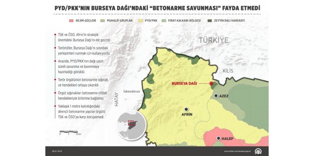 Türk Silahlı Kuvvetlerince, Zeytin Dalı Harekatı kapsamında 597 teröristin etkisiz hale getirildiği bildirildi. 44 hedef imha edildi TSK'nın Zeytin Dalı Harekatı kapsamında gece boyunca gerçekleştirdiği hava harekatında,PKK/KCK/PYD-YPG ve DEAŞ'a ait 44 hedef imha edildi. Açıklamada, harekatla ilgili şu bilgilere yer verildi: "Hava Kuvvetleri tarafından gece süresince gerçekleştirilen hava harekatı ile PKK/KCK/PYD-YPG ve DEAŞ terör örgütlerine ait sığınak, barınak, mühimmat deposu ve silah mevzii olarak kullanılan 44 hedef imha edilmiştir. Harekata katılan 25 uçak emniyetle üslerine dönmüşlerdir. Türk Silahlı Kuvvetlerince desteklenen 4 Özgür Suriye Ordusu mensubu hayati tehlikesi olmayacak şekilde yaralanmıştır. Zeytin Dalı Harekatı kapsamında bölgeden elde edilen bilgilere göre gece süresince 40 PKK/KCK/PYD-YPG ve DEAŞ terör örgütü mensubu etkisiz hale getirilmiştir. Harekatın başlangıcından itibaren etkisiz hale getirilen terörist sayısı 597 olmuştur." Açıklamada, hava harekatı ve kara ateş destek vasıtaları ile desteklenen Zeytin Dalı Harekatının planlandığı şekilde başarıyla devam ettiği belirtildi. Terör örgütü PYD/PKK hedefleri ateş altına alınıyor Zeytin Dalı Harekatı'nın 10'uncu gününde Kilis-Hatay hudut bölgesindeki Darmık Dağı çevresinde belirlenen terör hedeflerine Fırtına obüsleriyle zaman zaman atış gerçekleştiriliyor. Terör örgütüne ait hedeflerden dumanlar yükselirken top sesleri, Kilis'in sınır hattındaki bazı köylerden duyuluyor.  Türk savaş uçakları da sınırda uçuş yapıyor.